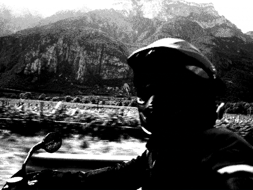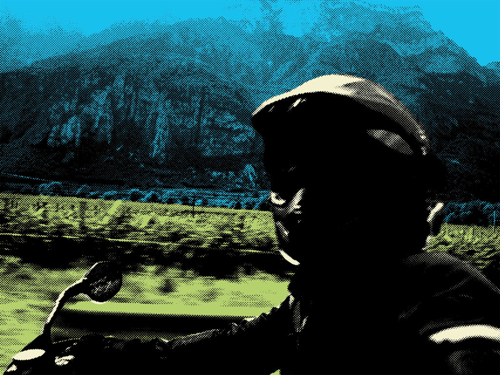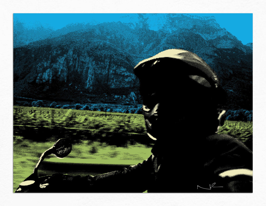 Italy In Transit fuses movement and stillness: the freedom of the open road captured mid-ride against the Italian Alps. New layers of blue and green pulse with energy, transforming a fleeting moment into something mythic. A pure expression of Norman’s life behind the handlebars, where the road = meditation.