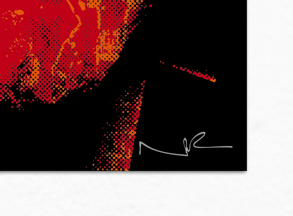 Two-Faced turns Norman’s own image into a split portrait of identity and expression, rendered in fiery reds and deep blacks. Echoing his fascination with masks and altered identity, the image blurs the line between the man and his many faces. Also available as a Black and White Metal Print.